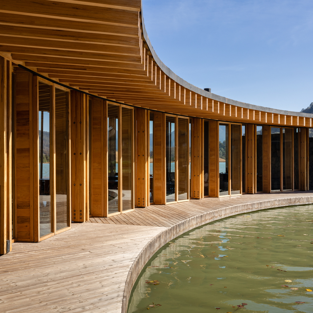 Valle San Nicolás俱乐部项目采用了交叉层压木材(CLT)建筑系统,梁柱结构按圆形平面的径向轴线分布,进一步凸显出圆环形的建筑体量结构。