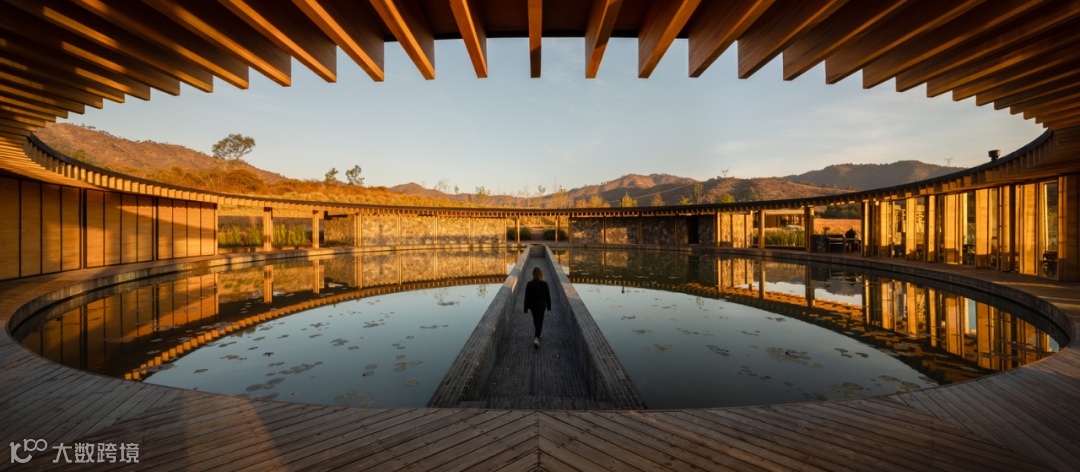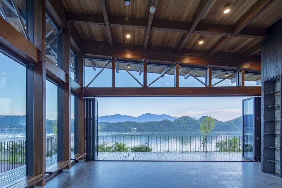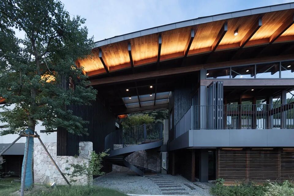 浙江建德绪塘人家驿站建筑上部使用胶合木结构支撑起整片的弧形屋顶。
