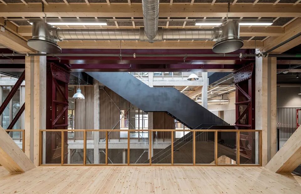 瑞典Gjuteriet大楼的内部设计在现有的钢结构框架中置入了胶合木和CLT。