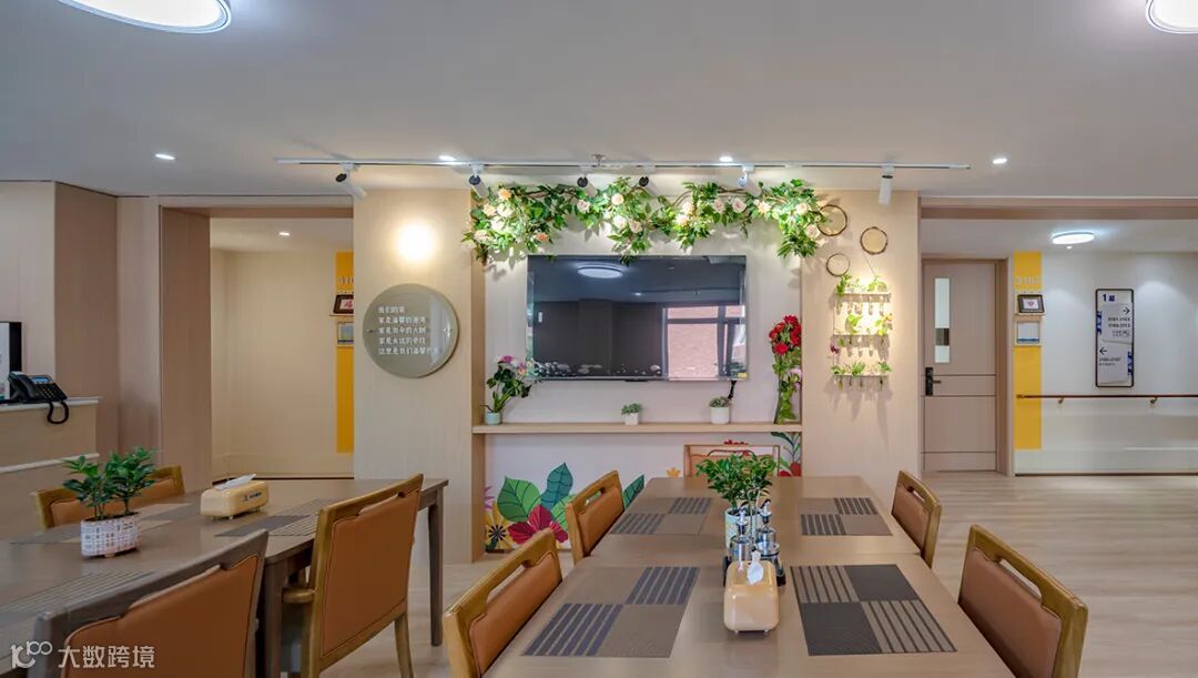 本案中的认知症长者专区,由单人间组成小规模生活单元,给予长者私密的居住环境和亲切的公共空间尺度。每层的单元起居厅承担着起居生活“大客厅”的角色,长者可以在此用餐、会客、休闲活动。每层均有不同主题色,老人房间门口设置独特的装饰品,提高认知症长者对楼层和房间的识别度和归属感。