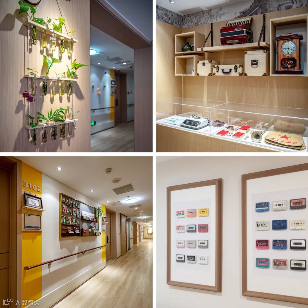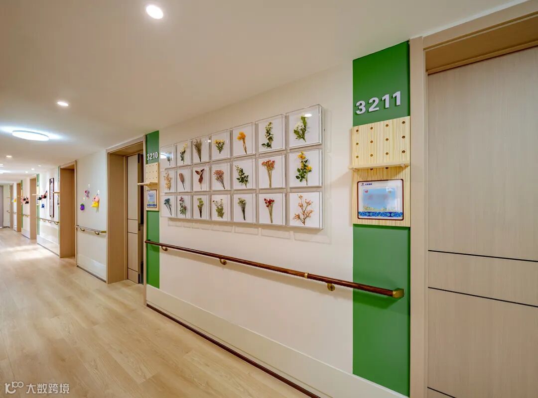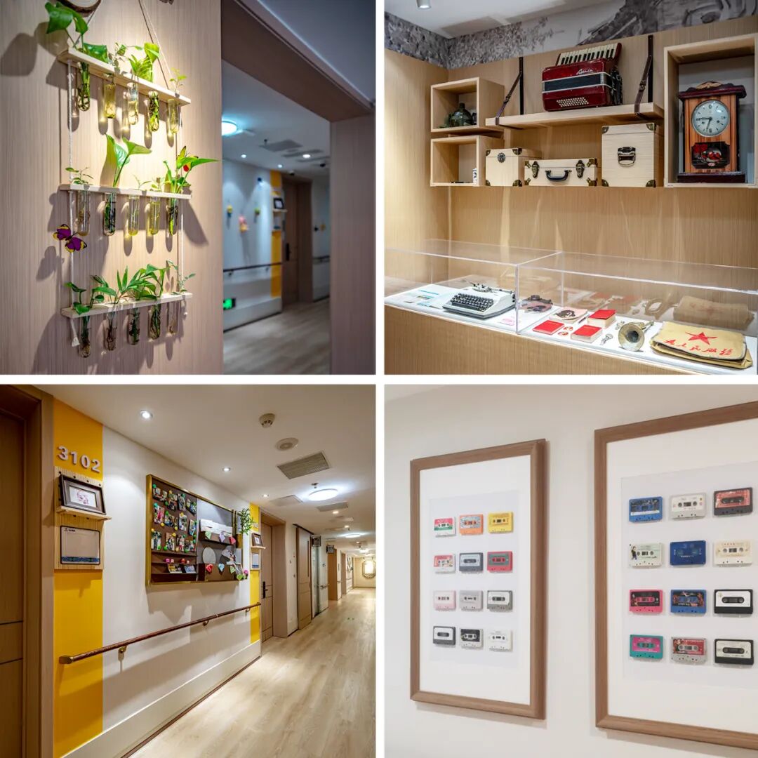 室内装饰简约温馨,避免过度的设计,着重消除长者们对陌生环境的不适感。公共空间布置各类复古怀旧的装饰品、感知觉训练玩具、绿色植物;走道疏散门的彩绘,拉近人与空间的距离。强化室内照明,扶手颜色与墙面形成强烈对比,便于长者识别扶握。