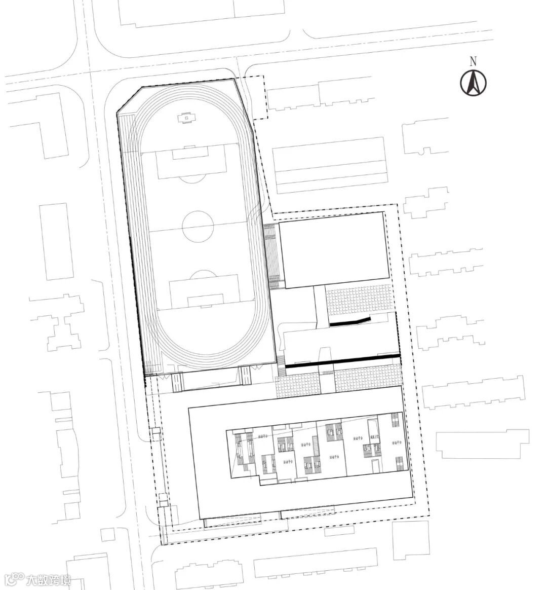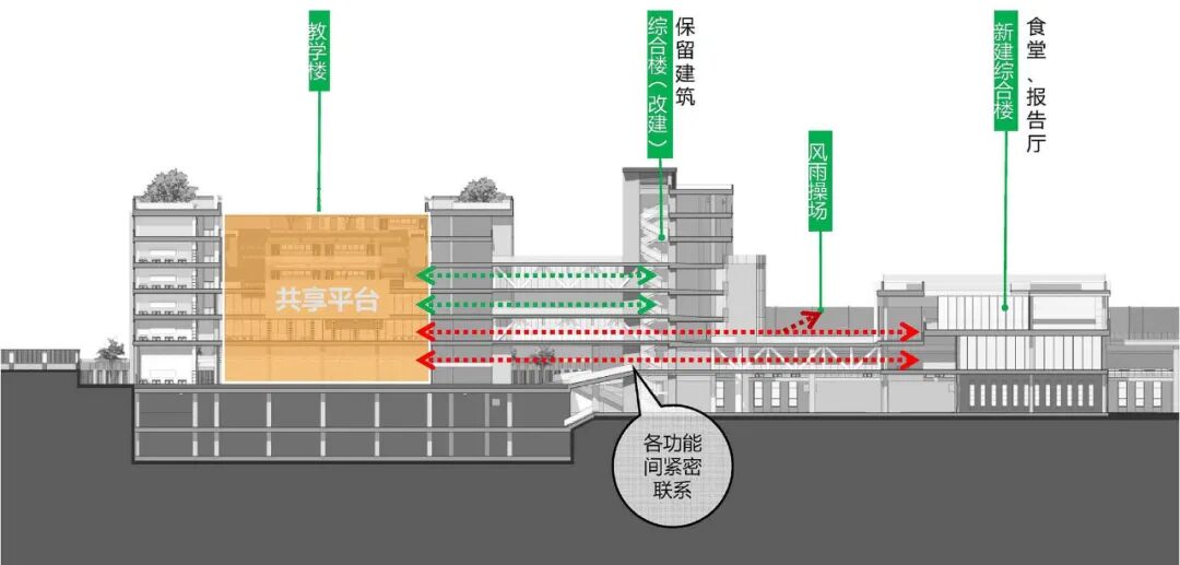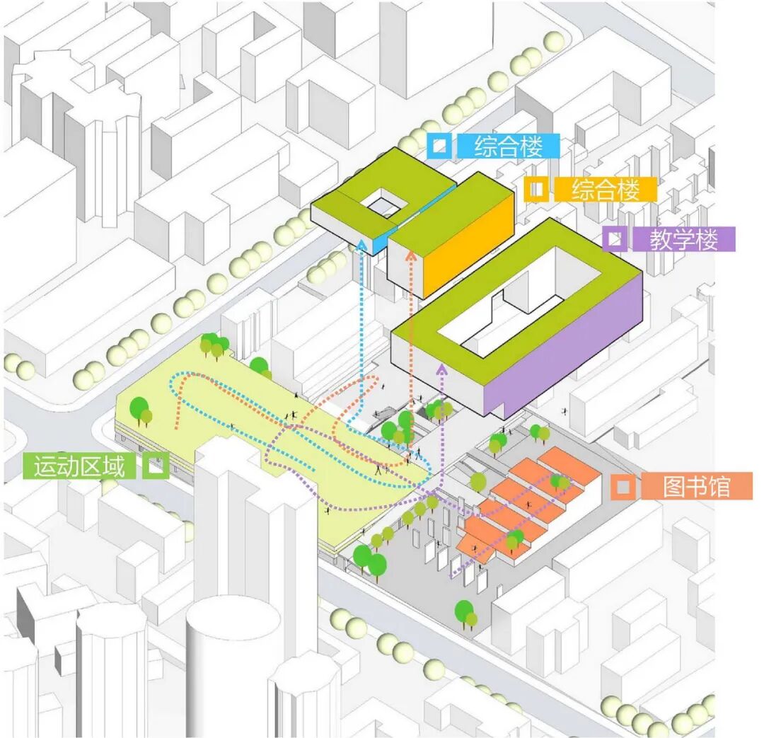 Superposition of Functions - The main teaching functions of the project are arranged on the south side of the site, and the teaching functions and teaching auxiliary functions are vertically superimposed to solve the problem of tight land use for the project. The teaching building and the comprehensive building are relatively independent of the overall plan and are interconnected through overhead floors and platforms. The library, landscape platform, and corridor serve as connecting systems, connecting various functional blocks.