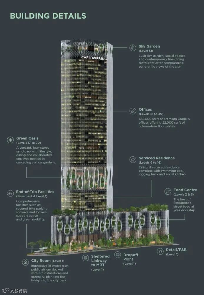 曲折婉转的花园小径将人缓缓引入大厦旁边一座19米高的绿荫环境。大厦从底面上数八层作为居住功能,除此之外,这些楼层还设有游泳池,温泉浴,环游步行道,健身房,社交餐厅,公共休息大厅和户外烧烤区。从顶部向下的二十九层为高级办公区。在这里,员工们拥有360全景体验,饱览新加坡河和滨海湾风貌。大厦的内部核心区坐落着四层高的自然景观区域“绿洲”。30米的开放花园为大厦的使用者带来工作,休闲和放松等日常活动处所。