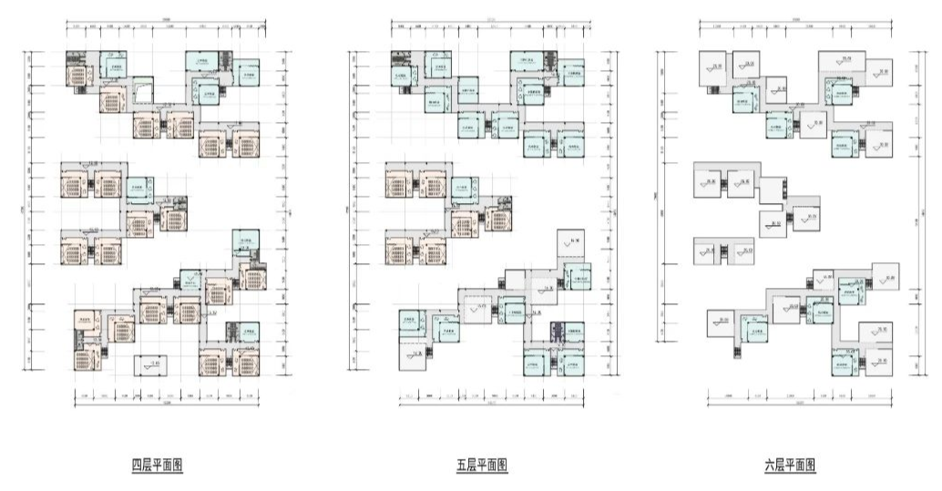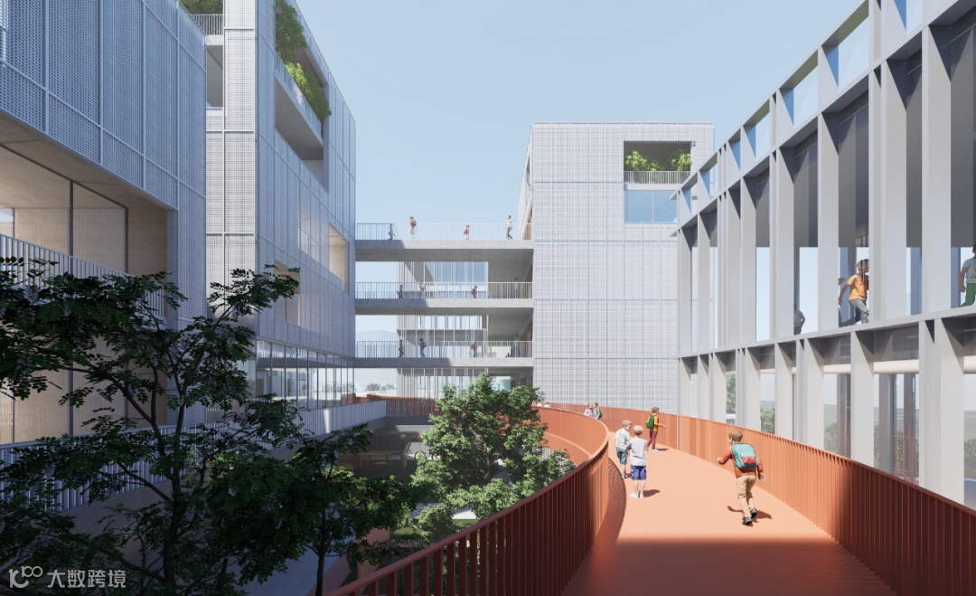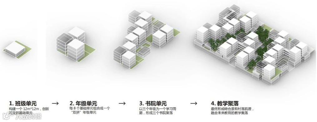 每8 个教学单位组合成一个“双拼”单元,并结合配套与专业教室,形成年级单元,年级之间保持相对独立,互不影响,年级之间通过连廊串联链接。