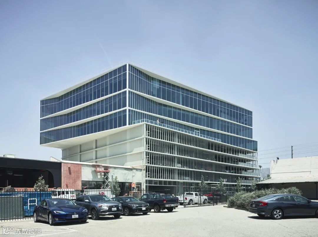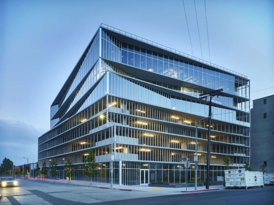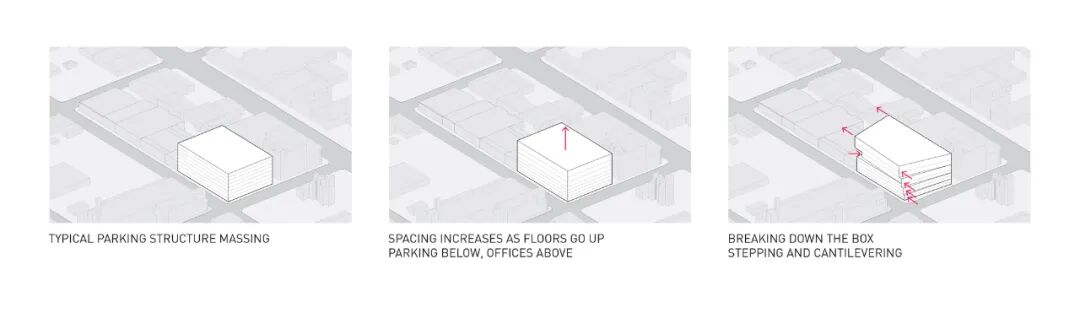 LOHA developed the massing of the new retail and creative office building through a combination of exterior and interior strategies. By maintaining a consistent floor-to-ceiling height for the garage levels, the office floors can begin to twist and pull apart, becoming incrementally taller to lift up from the parking base and create desirable spaces for creative work.