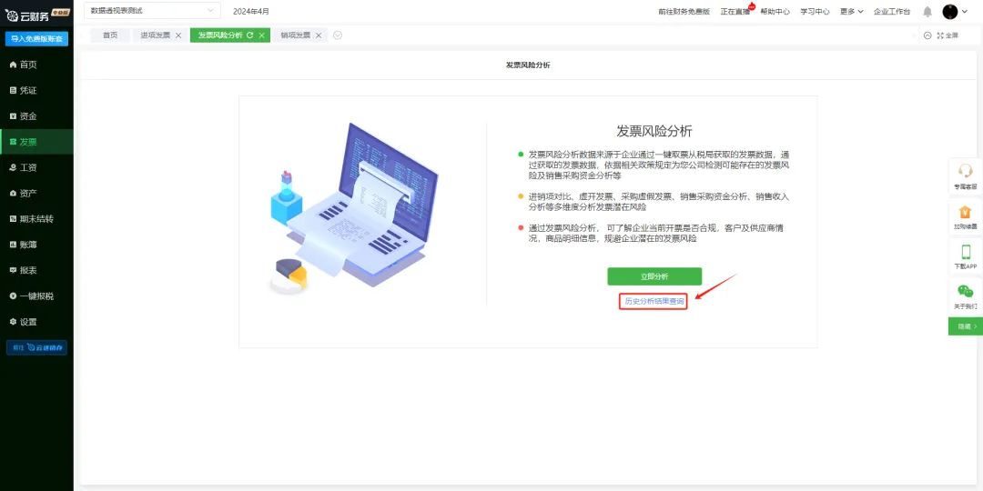一、点击菜单栏【发票】-【发票风险分析】进入页面