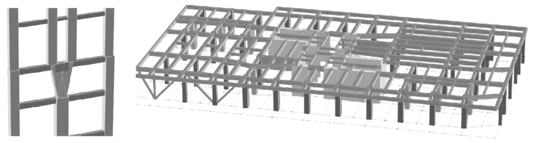典型塔楼标准层结构布置在标准层平面中Z型的两肢沿Y方向布有四根框架柱。裙楼设置悬挑桁架+吊柱的型式,实现建筑裙楼通透视角。