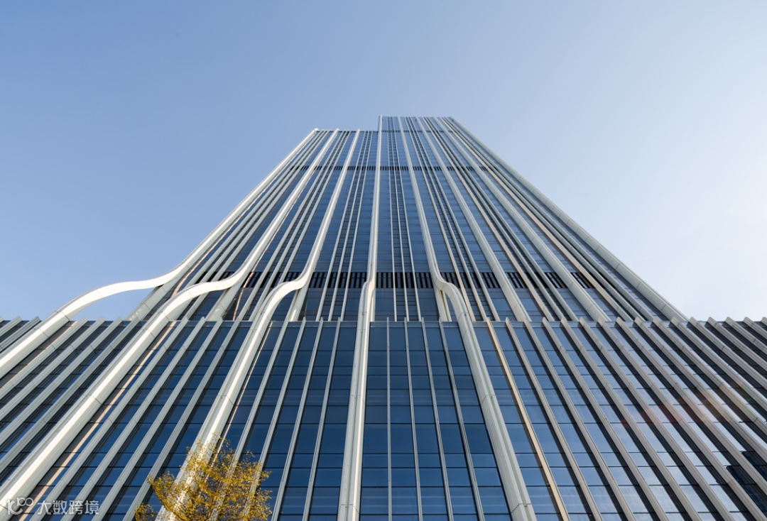 塔楼从顶部到底部体量慢慢增大,弧线渐渐展开,如蜿蜒的“溪流”,顺滑往前,一泻而下,一气呵成。