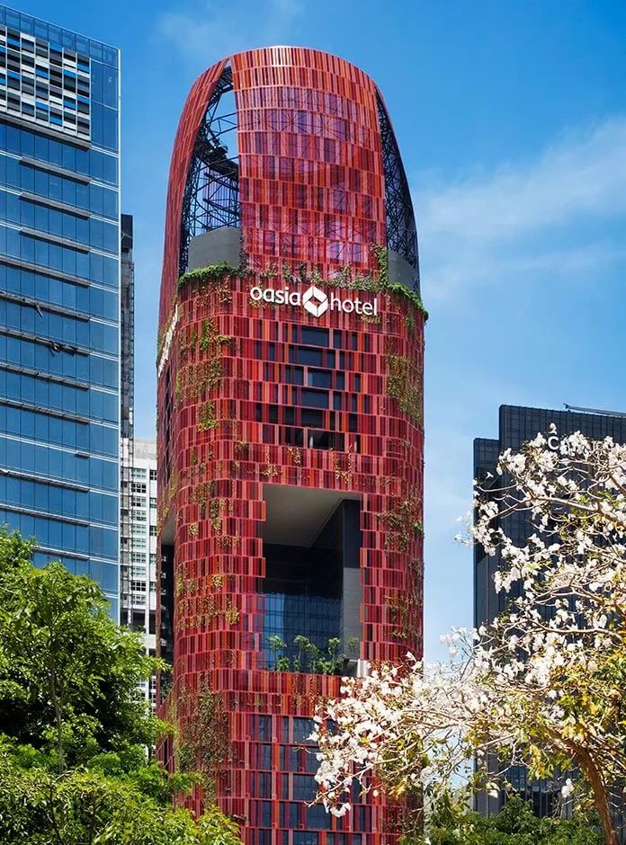 一座青翠的塔楼矗立在新加坡密集的中央商务区里,Oasia酒店是热带城市土地集约利用的模范。