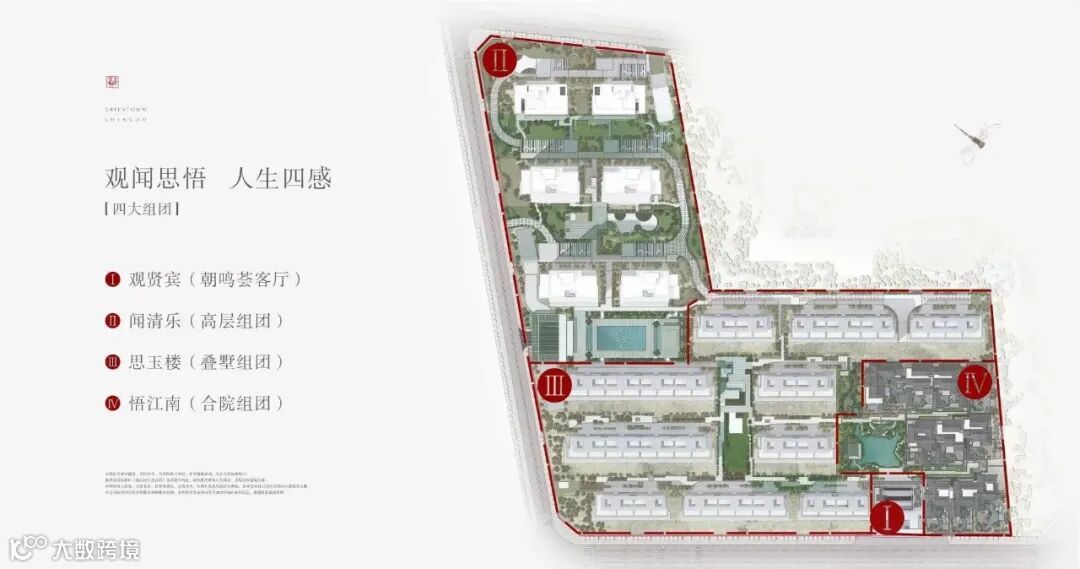 四感:是指荟客厅、高层、叠拼、合院区四个区域的,我们结合对生活的睿智与思考,并参考了《花间集》的词牌名,以观、闻、思、悟四感进行命名,分别是观贤宾、闻清乐、思玉楼、悟江南。