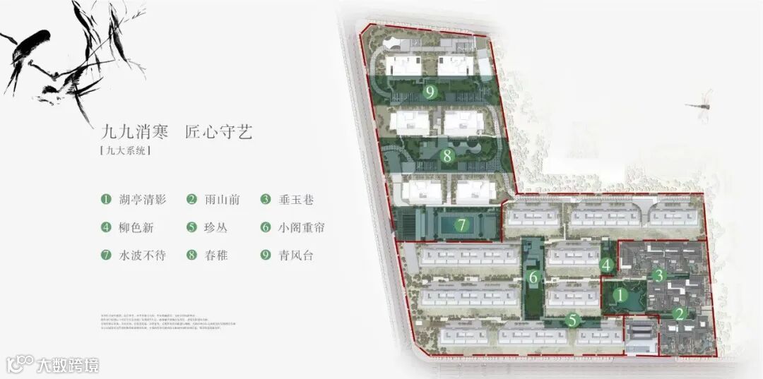 九锦:是园区九个小的景观组团,有“湖亭清影”、“雨山前”、“垂玉巷”等,每个小组团的名字中取一个字,连起来正好是:“九九消寒图”——亭前垂柳珍重待春风。