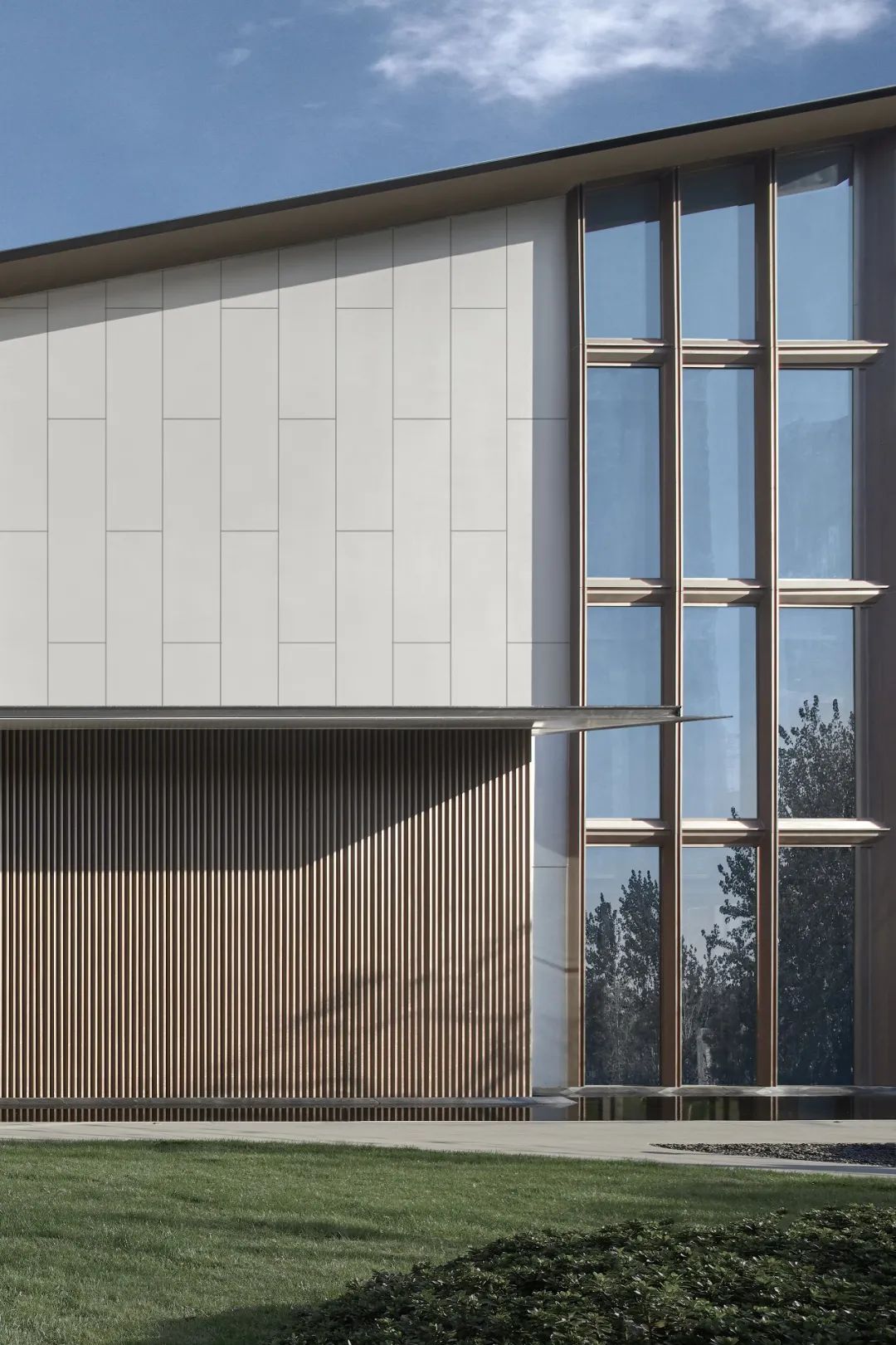 铝镁锰板的屋面起伏变化,于转角形体交错起翘形成制高点,配以仿木纹铝板的对比勾勒,线条感与连续感得到升华。