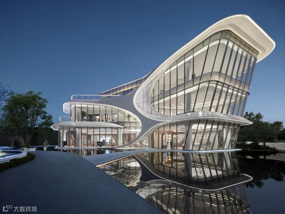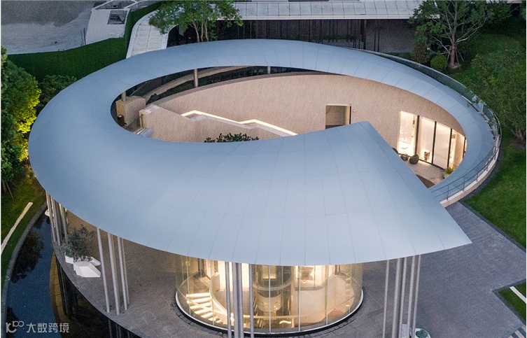 比如杭源里的“超流体”艺术生活馆,圆角曲线的外边缘就采用超薄的蜂窝铝板包裹石材肌理的亚克力板,暗藏有LED灯,夜晚透光,大面积超白玻璃幕墙与水环境叠加,强化超流体建筑的反重力感。