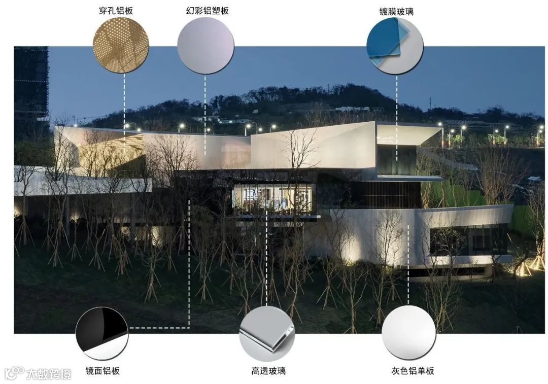 杭州中海·黄龙云起示范区整体选用仿石纹理铝板、仿铜拉丝铝板,LOW-E白玻璃幕墙及浅灰色铝板、深灰色铝板五种标识性材料,结合不同的功能空间合理划分材质范围。