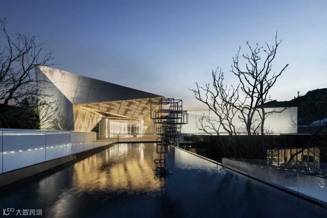 如重庆龙湖云瑶玉陛示范区,底部盒子的设计为黑色镜面铝板,匍匐并消隐在山坡之上。金属表皮映衬着光影下的婆娑树枝,柔和轻盈朦胧的形象展现在眼前。