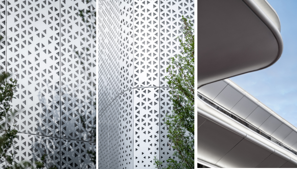 玻璃幕墙使室内外互为景观,保证了良好的视觉通透性;珍珠白色铝板经过精细的节点加工,构成曲面围护体系,如白云般轻盈的,在白日与夜晚体现出不同的魅力。