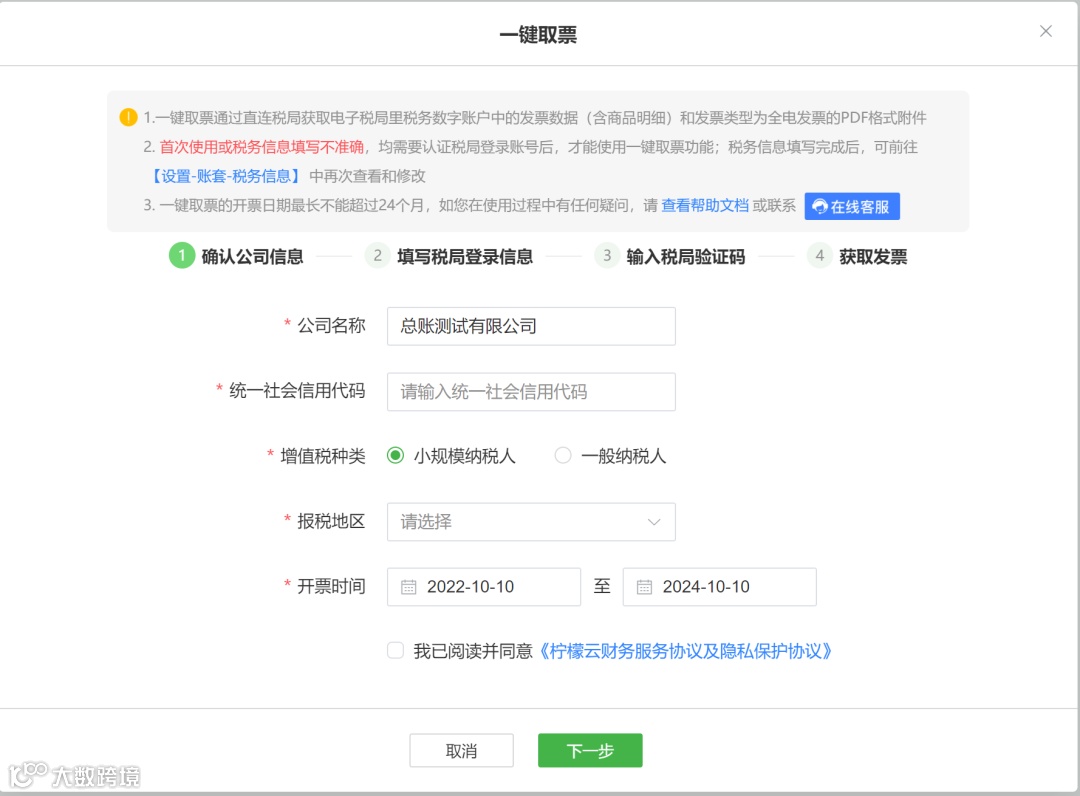 点击进入【发票】-【一键取票】-【立即取票】填写税局登录信息后即可获取发票