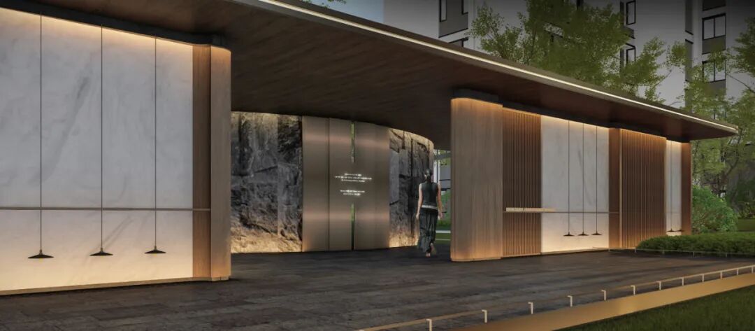 安缦酒店式社区大堂是美学之门。大门两侧,以叠片式景墙增强空间向外延伸的审美张力,再利用自然的光影凸显肌理的强烈对比,打破场地秩序。自然面的石材与金属结合,创造视觉冲击,营造出充满艺术气息、让人放松的归家仪式感。