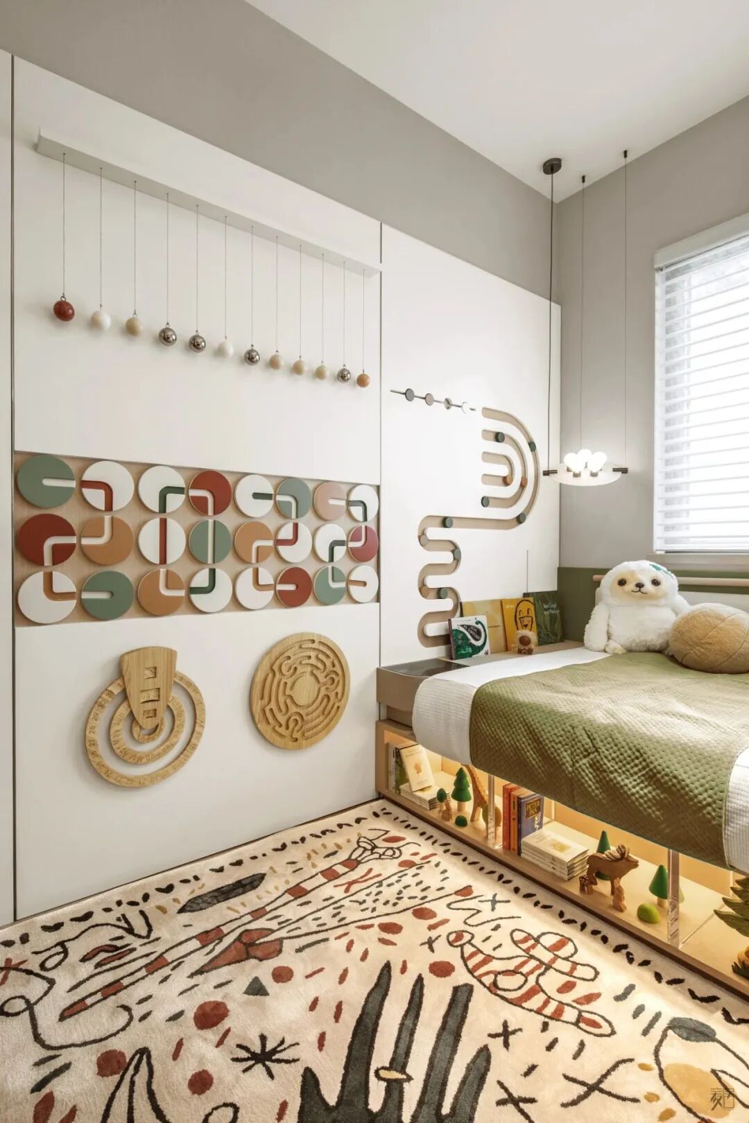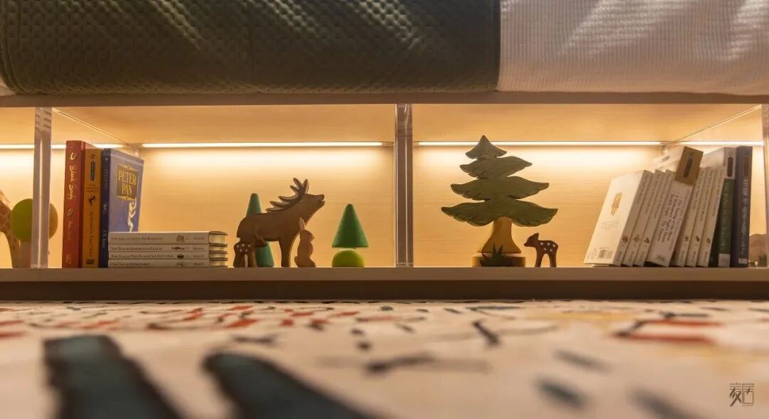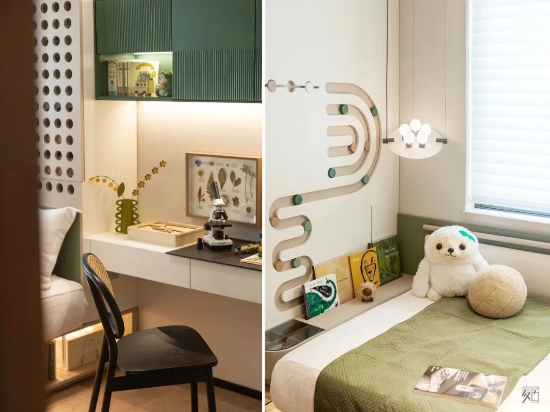 男孩房延续博物学的主题,融合大自然的清新配色,仿佛林中有小鹿在奔跑,有绵羊在吃草。房间里面的每一件物品,都是爸爸妈妈陪我去林中游玩时收获的“瑰宝”,把它们小心地制作成标本,细细珍藏。