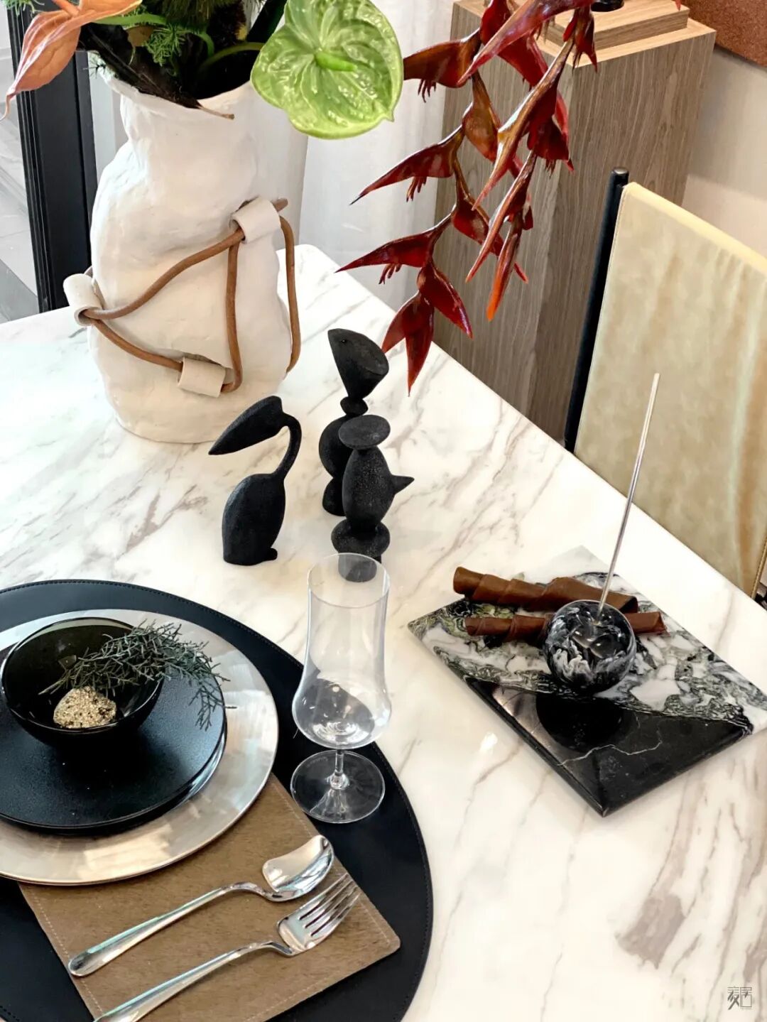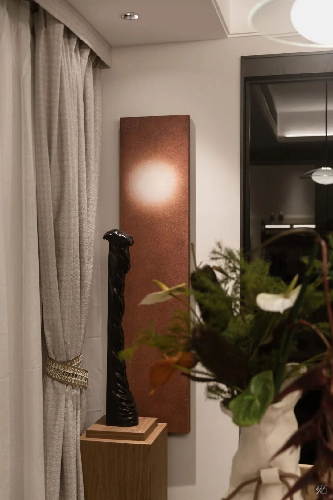 在软装陈设上,整体呈现出复古的轻南洋风,轻松、自然。通过物件物理尺度的对比及自然材质的结合,丰富了层次,也营造了舒适之感。大理石材质搭配艺术木雕,利用这种对比关系产生放松、宁静的状态。纯粹的几何艺术表达,强化了空间的视觉美感,具有明显的精神属性。