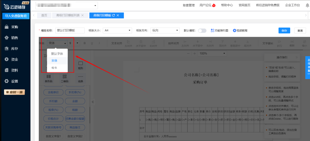 4、高级打印模板支持选择多种字体:"默认字体"、"宋体"、"楷体"。