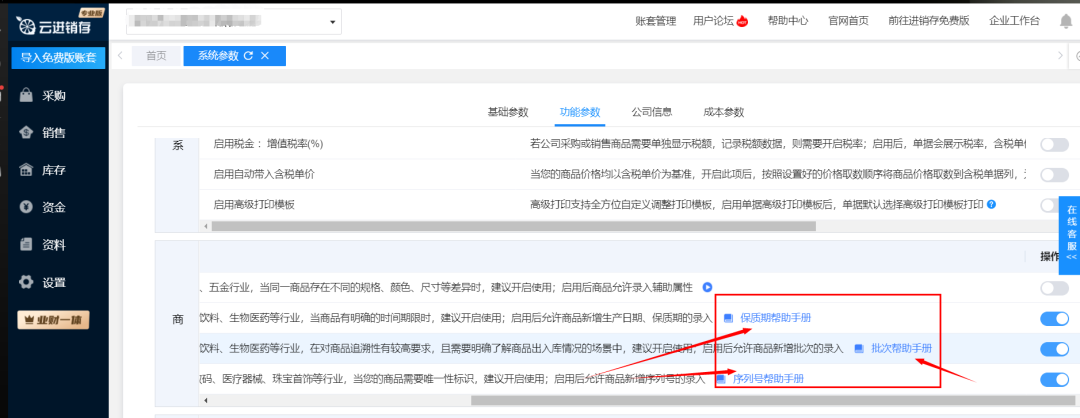 1. 管理员点击【系统设置】——【系统参数】——【进销存参数】,可以控制系统是否开启序列号、批次、保质期。启用后,才可以对商品进行序列号/批次/保质期的管理。
