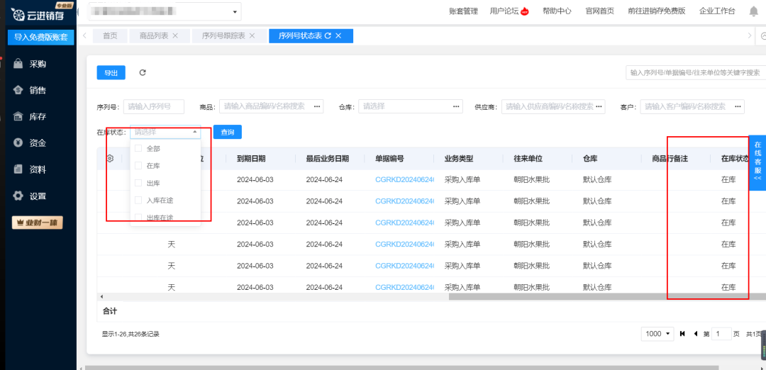 序列号状态表中,记录了这个序列号是否在库。如果您开启了审核的功能,未审核的序列号则是在途状态。