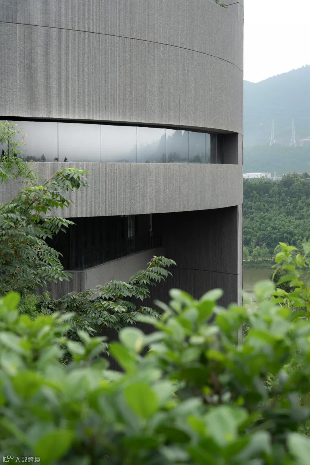 方案立面由两江的形状生成,去除多余的装饰和刻意雕琢,以静谧的雕塑感置入生动的自然之中。我们选用清水混凝土挂板作为立面主材,以呈现整体的、肌理质朴的建筑形象。为了消除板材尺寸对立面的分割感,板材肌理选用竖向拉槽、手工打毛,令竖向分缝在视觉上隐藏起来。同时横向分缝设置为30mm,着意加以显化表达,并采用4.30m作为基本模数,减少立面板材的模具数量,提升建造效率,并以此模数控制立面的开洞位置和尺寸,以简洁、单纯的外观质感呈现建筑的形体变化。
