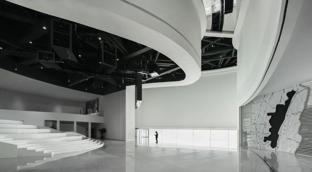 嘉陵江和长江交汇出了独特的重庆文化,这也成为重庆最具辨识度的符号和标签。我们设计选取两江交汇的形状作为图形文本引入场地,在完整的圆厅平面之上,由两江图案形成的标高变化,暗示平面的三个主题——规划展示的高空间区域、模拟山形的展台、展墙区域。