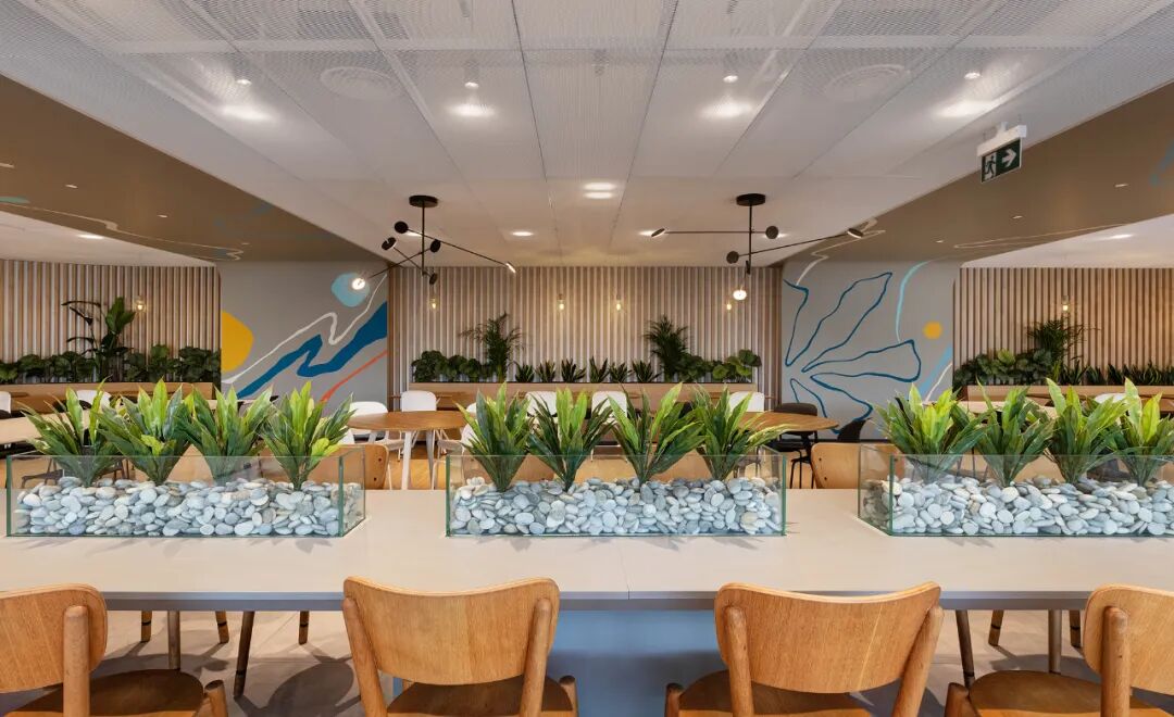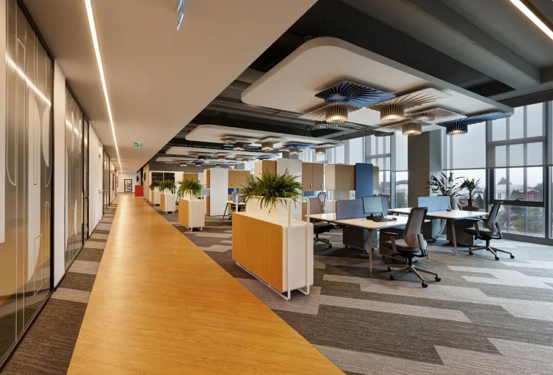 员工被赋予了选择工作地点、时间和方式的自由。短暂的休息区被规划出来,在连接行政部门和工程部门的流通轴上行走时可以举行短暂的会议。在方案允许的范围内,整个楼层增加了具有不同规模、功能和形式的社交区域、个人和协作工作、会议和咨询空间,以提高使用的灵活性。此外,环境友好性和可持续性也是设计方法的重要组成部分。在这种情况下,14条亲水设计路线和概念,如 "空间中的自然"、"自然提醒 "和 "空间的自然",包含在 "亲水设计 "方法中,在项目中得到了体现。