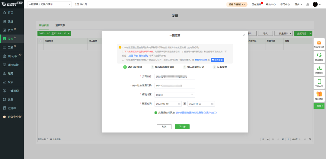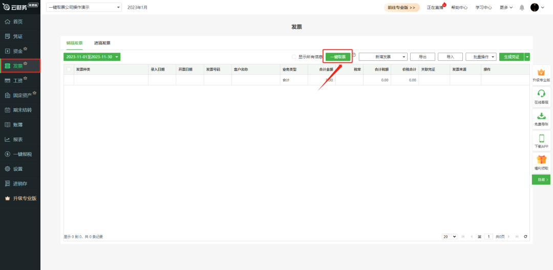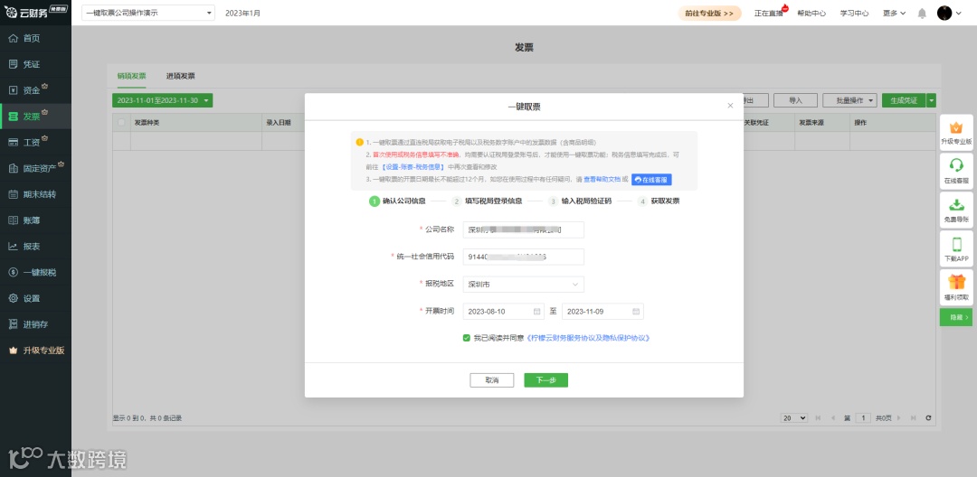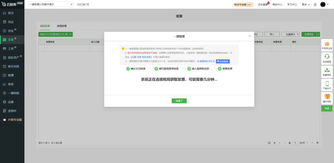 ①在销项发票或进项发票页面点击【一键取票】按钮,进入一键取票弹窗页面,完成对应取票步骤