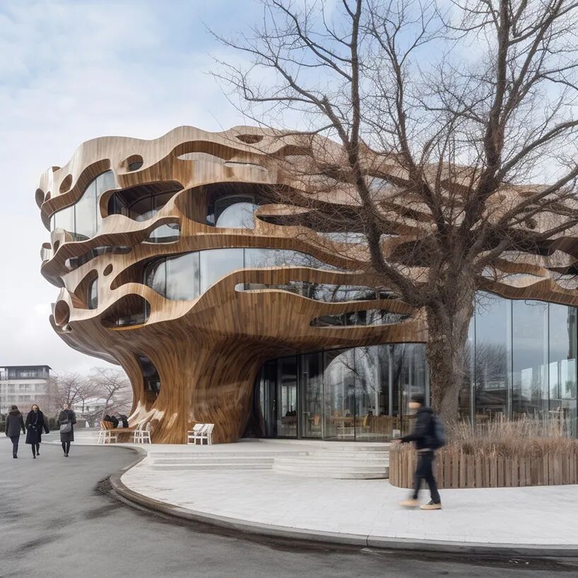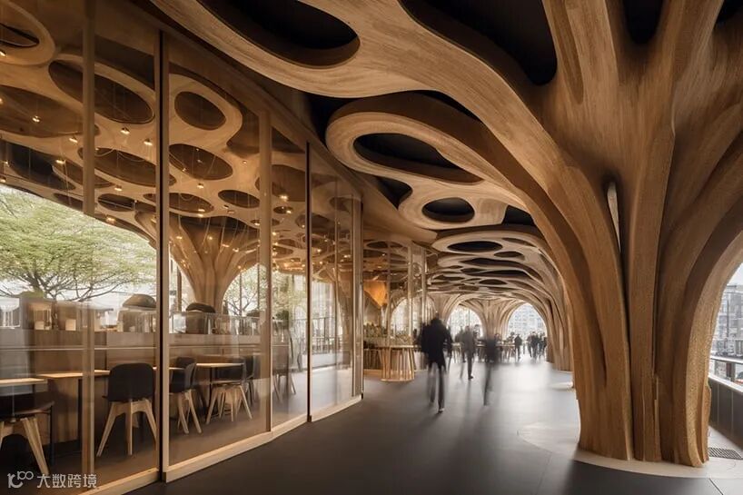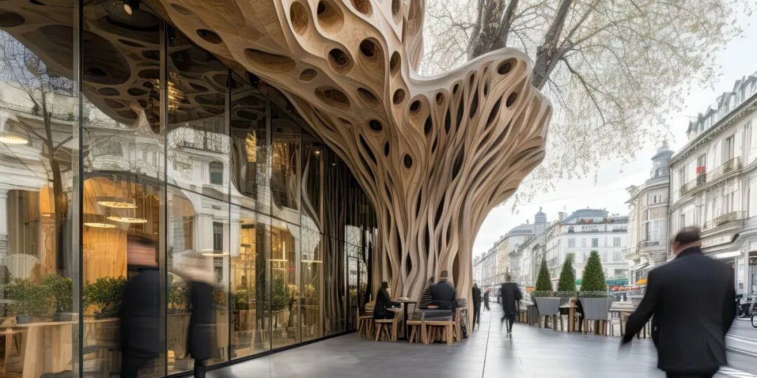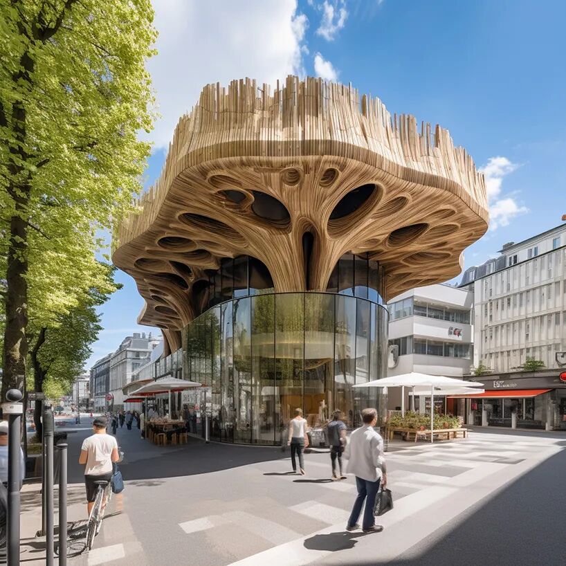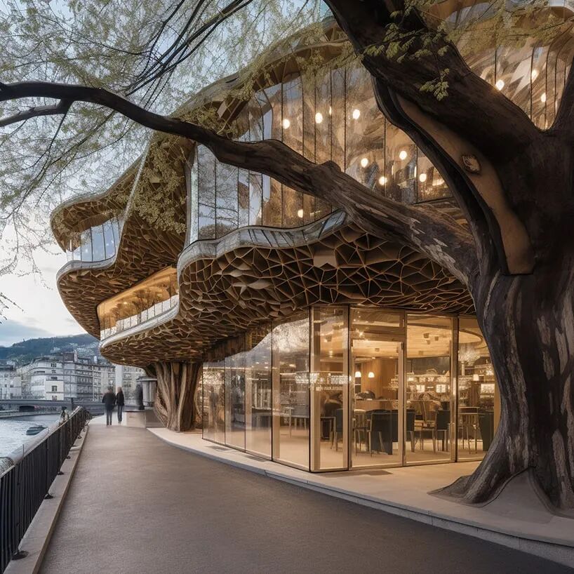 Drawing from the deep connections of architecture and nature that evoke ‘warmth, strength, home, love, life, and abundance’, designer Rolando Cedeño de la Cruz generates a Midjourney series of visualizations depicting organic structures, the ‘Tree Restaurants’. Through the means of artificial intelligence, the renderings illustrate an architectural language using geometric imitations of trees to form organic facades that wrap the glazed fronts of restaurants in a material that resembles wood. The nature-inspired design derives from the concept of the ‘Tree of Life’ being present in the collective unconscious in many cultures throughout history and reminisces of the abstract form of a forest.