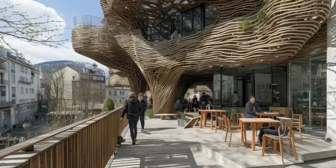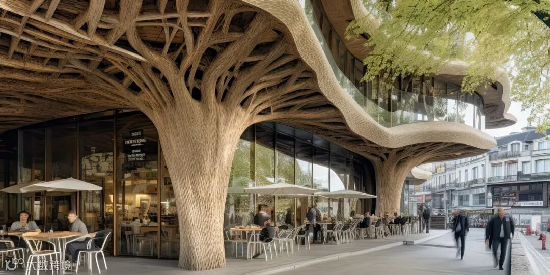 organic free-form tree restaurants grow amid the cityscape using midjourney