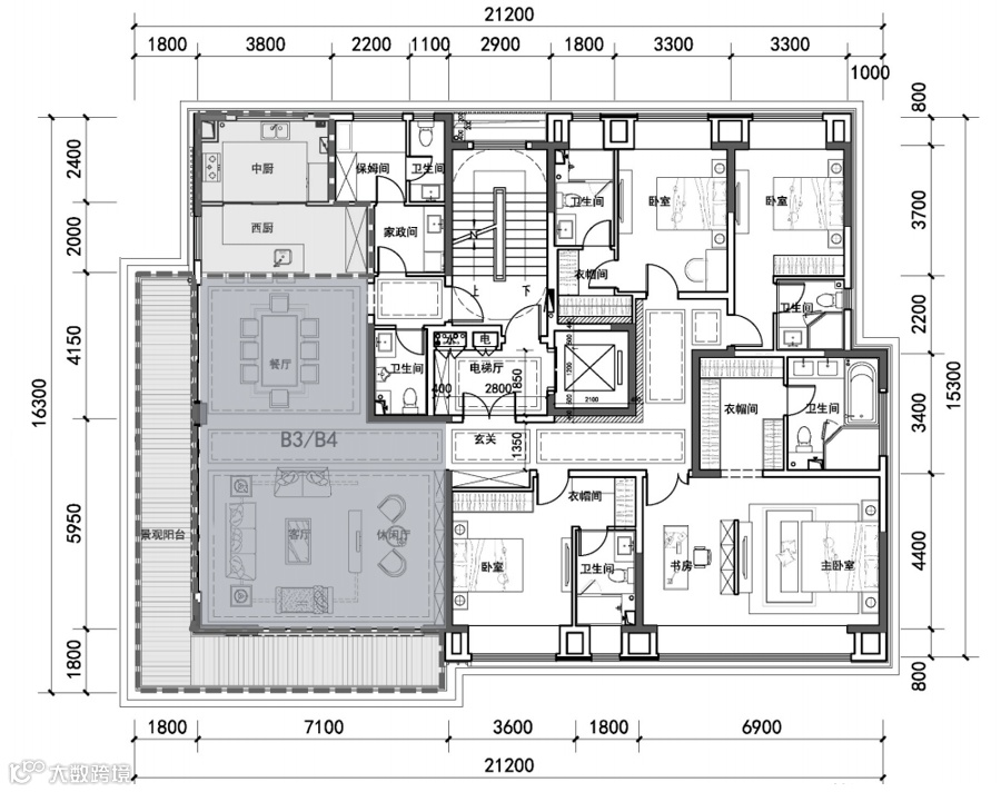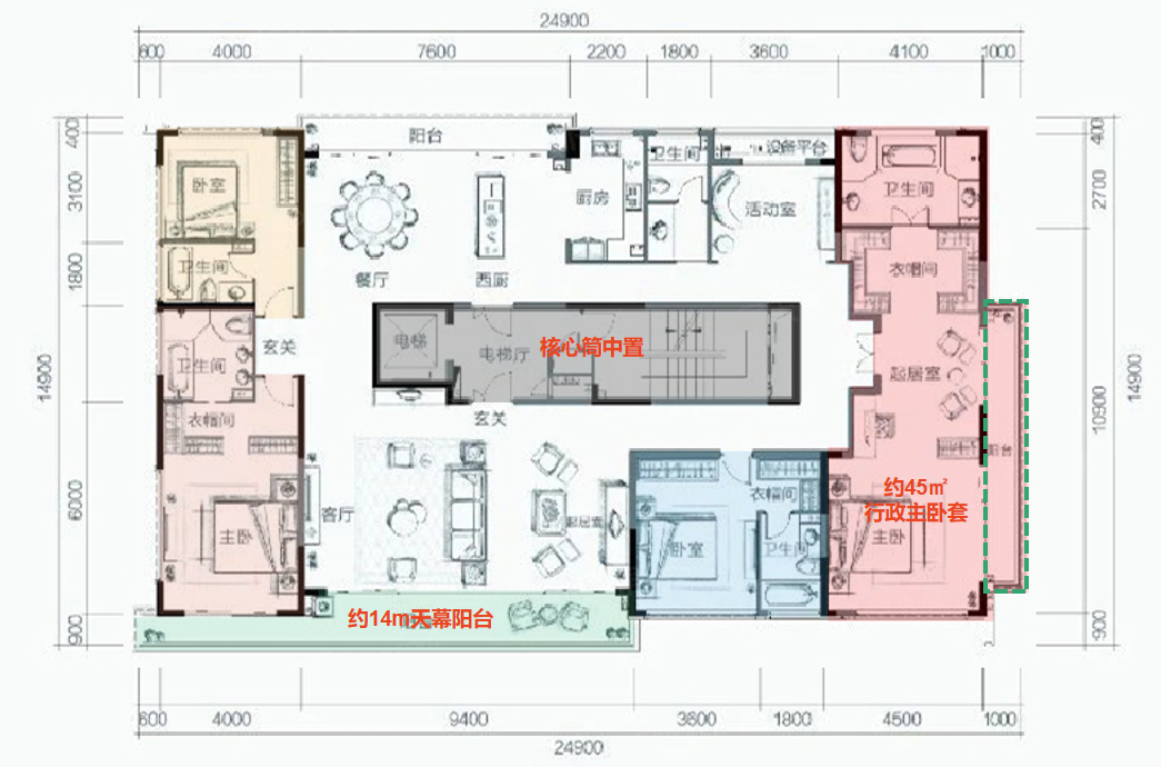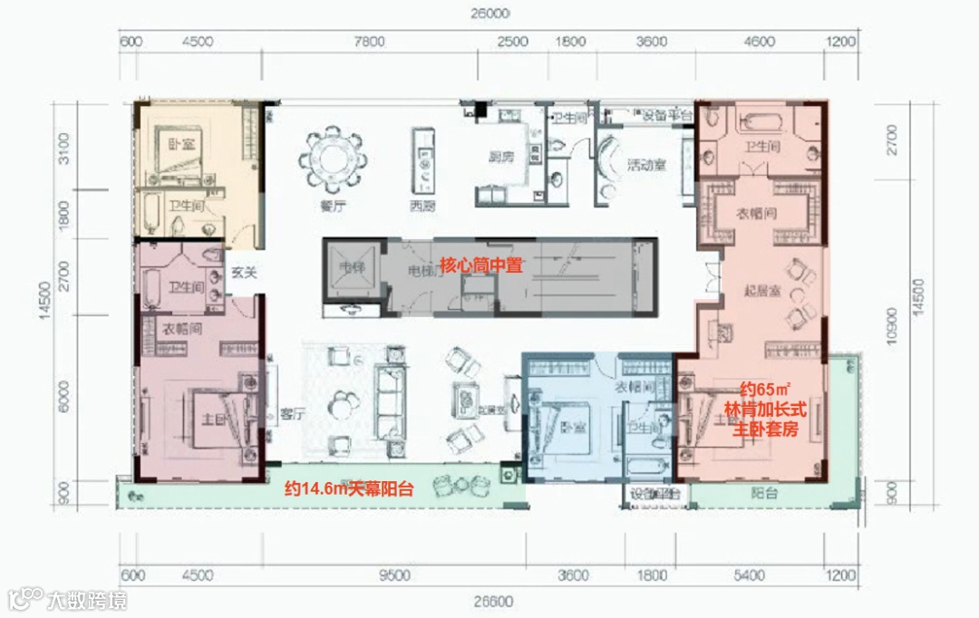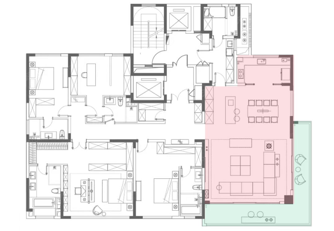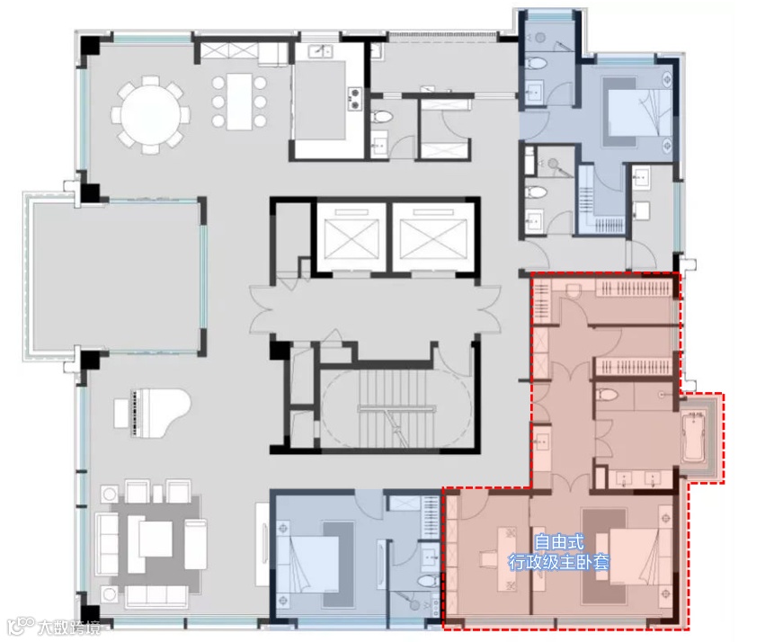 一层一户,双电梯入户设计;客餐厅+中西双厨+独立茶室,构成中央生活空间;室内4个套房,全部朝南,每一间都带独立卫生间,每一间都可以是“主卧”;东西两边双主卧套房,更带双衣帽间和起居室及L型阳台。