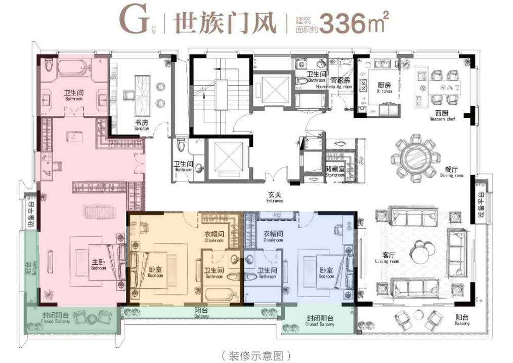 在户型上,洋房产品约300㎡的面积,采用了一层一户双入户设计,并配备有独立电梯入户。通过保姆家政房动线的差异化设计,实现了保姆家政的独立动线,在尽显尊崇的同时,确保了居住空间的私密性