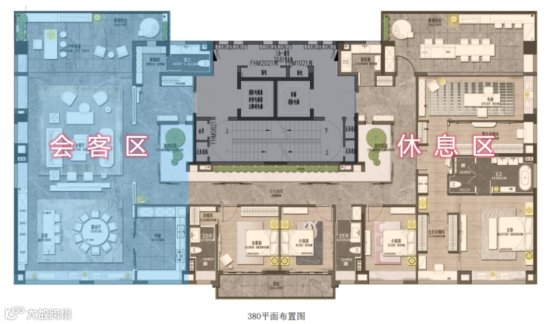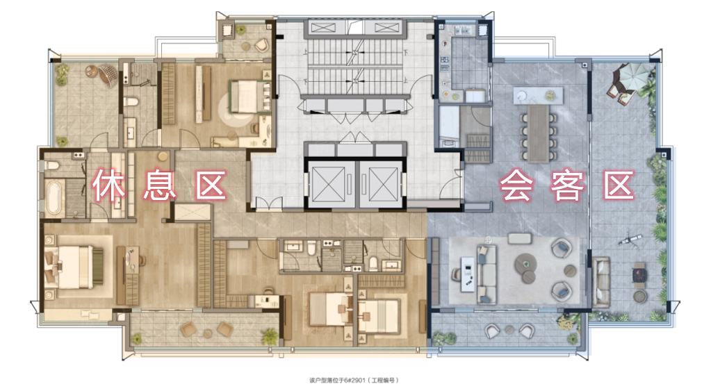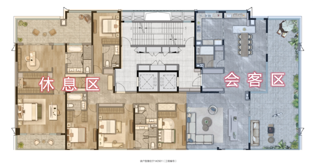 ②、中轴对称礼序,一方宴厅级会客场域,一方奢享级静谧居所