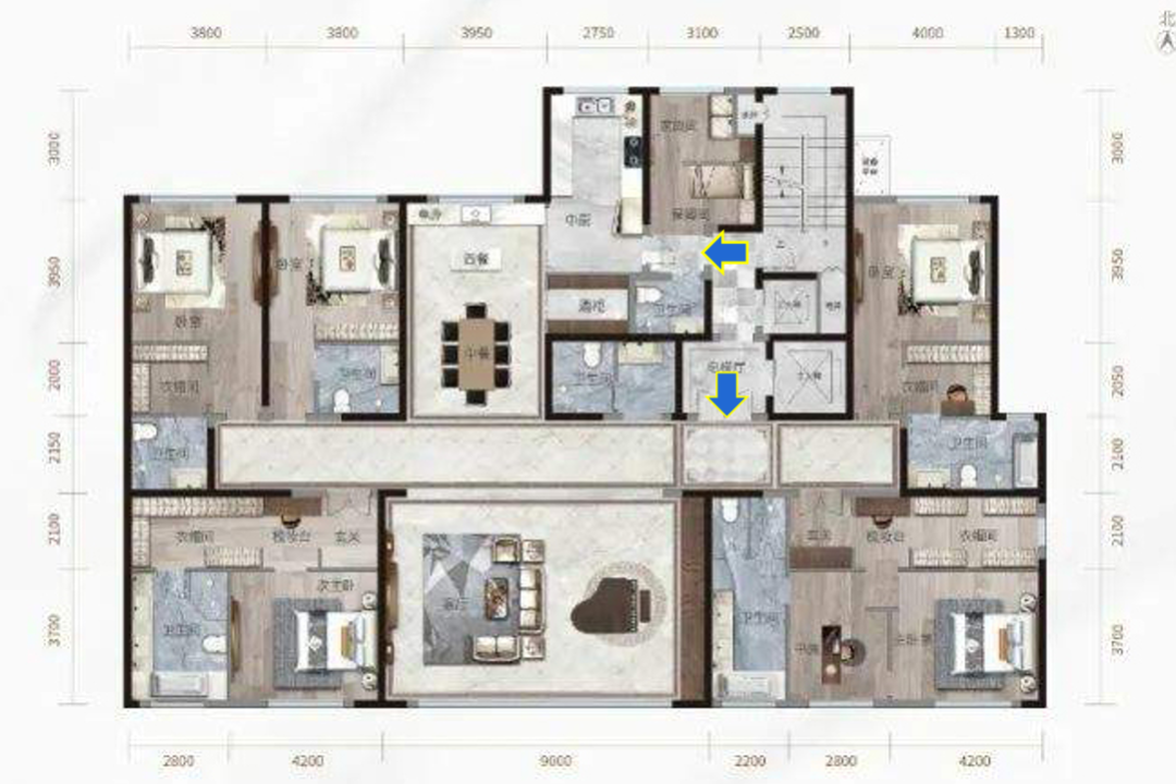 长约9米的奢阔宽厅,钢琴区域可以做开放式书房,和沙发区形成大横厅,并且和西餐厅、中餐厅形成正向南北通透。L型的超级活动厅,让居家氛围达到更佳,非常理想。东西两端分别是卧室区,西侧有三间卧室,全部都自带明亮窗户的卫生间,堪称奢华。可以满足不同功能的需求。