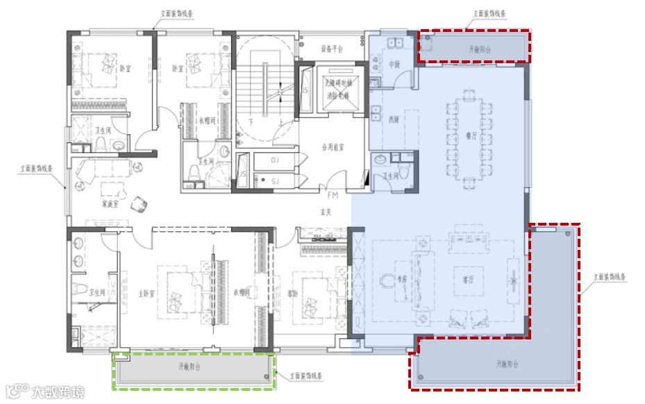 ①、超大尺度边厅+阳台设计