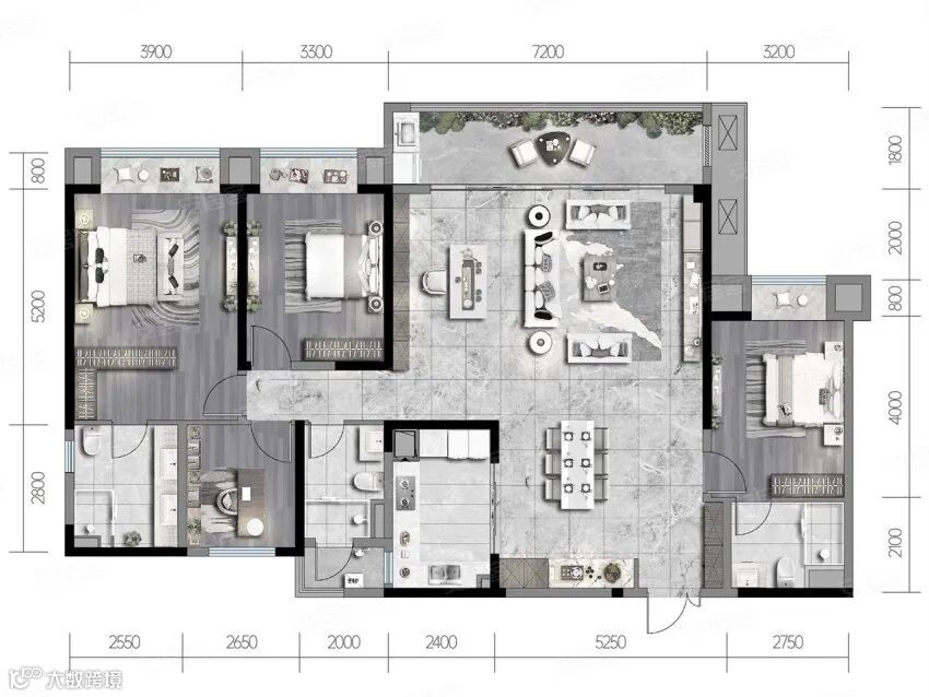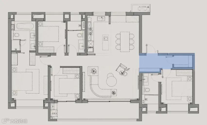 南向四开间设计,约7米开放式宽境横厅,拉长升了整个空间的尺度感与韵律感。