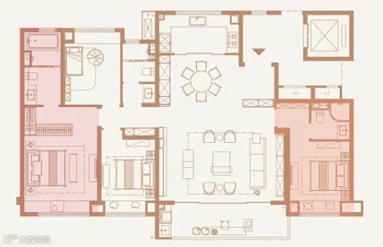 南京锦云台建筑面积约189㎡横厅户型,U型厨房搭配西厨岛台;大面宽短进深,南北通透,南向五开间约16米,约9.5米敞阔双阳台。