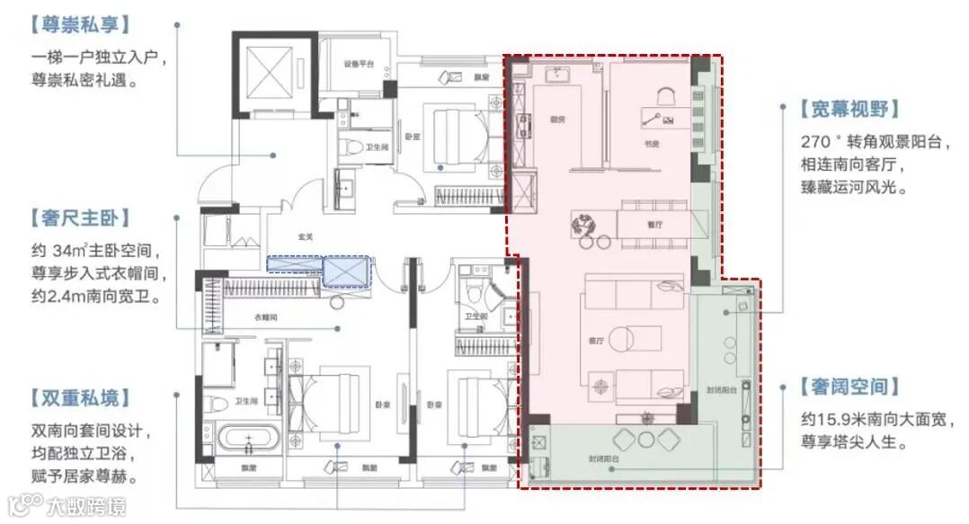 济南绿地·御山台建面约189平方大平层,一梯一户独有的电梯厅,有效保证生活私密与隐蔽性,约19米270°拐角大阳台,约16.5米南向四面宽,阳光可以毫无阻碍的照拂每处角落。