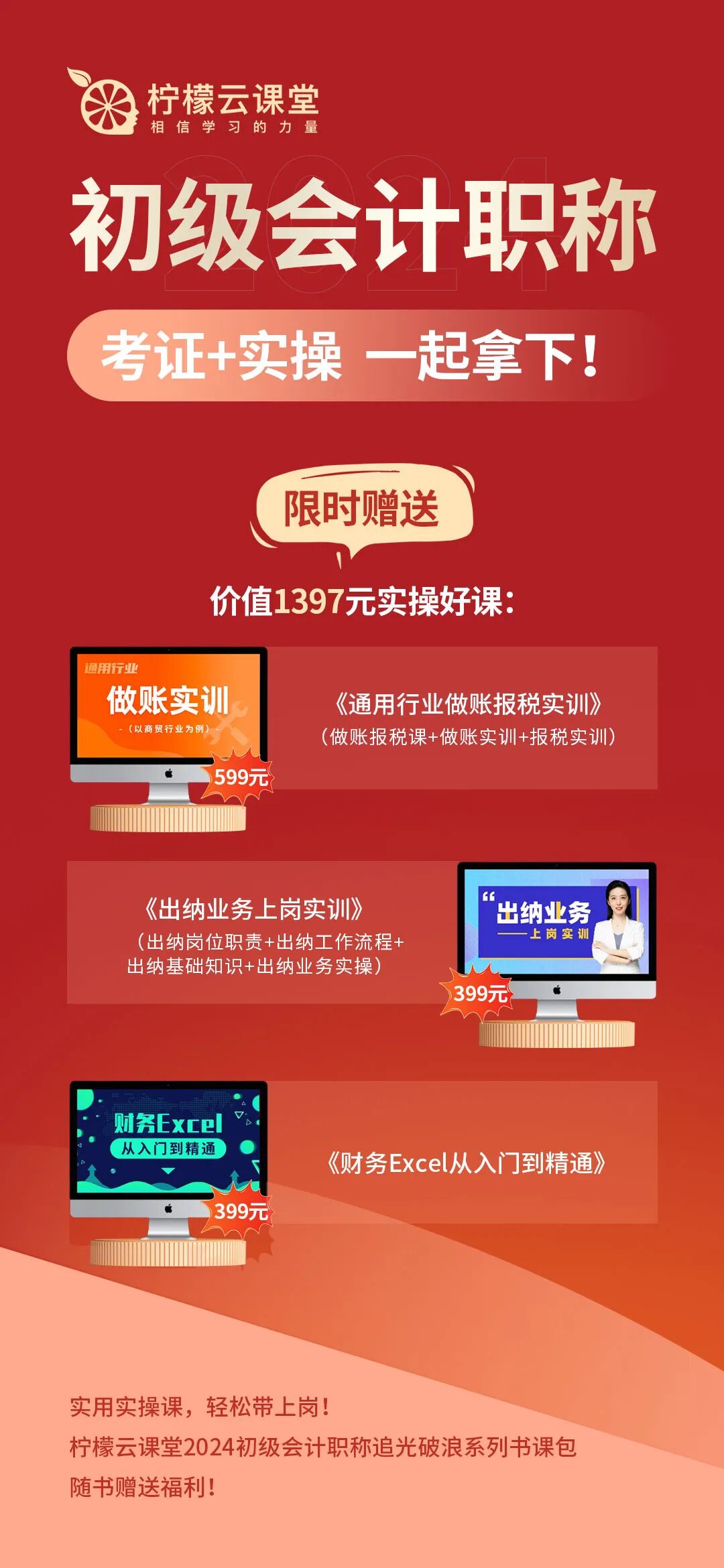 而且这个书课包还赠送了1397元的实操课程,包含《行业做账报税实训》课程、《出纳业务上岗实训》以及《财务Excel从入门到精通》课程,带你从考证到上岗一次拿下!