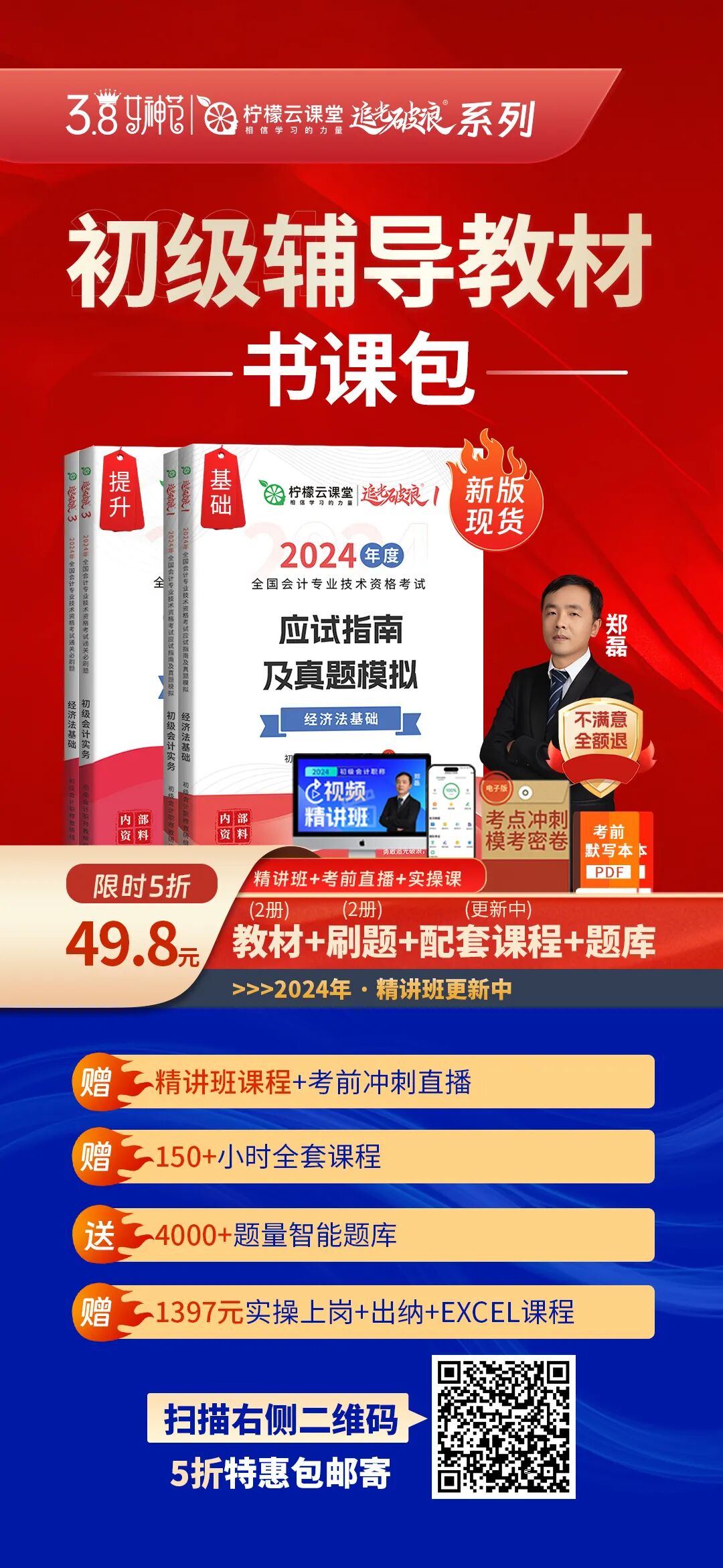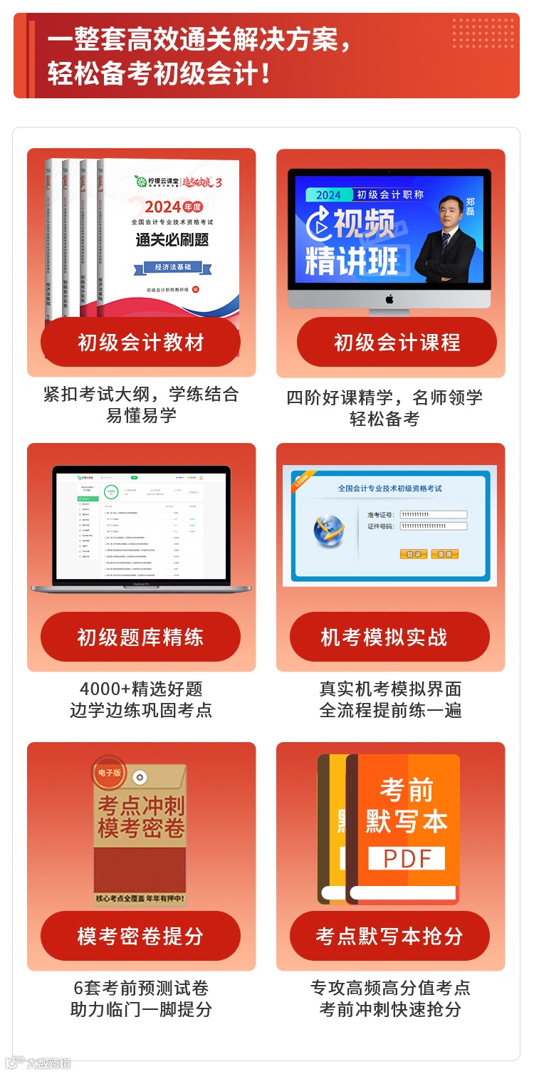 书是4本精编教辅图书,2本《追光破浪1·2024年度全国会计专业技术资格考试应试指南及真题模拟》+2本《2024年度全国会计专业技术资格考试通关必刷题》,课是2024年初级会计视频精讲课程,题是2024初级会计超大智能题库,包含考前预测卷等。