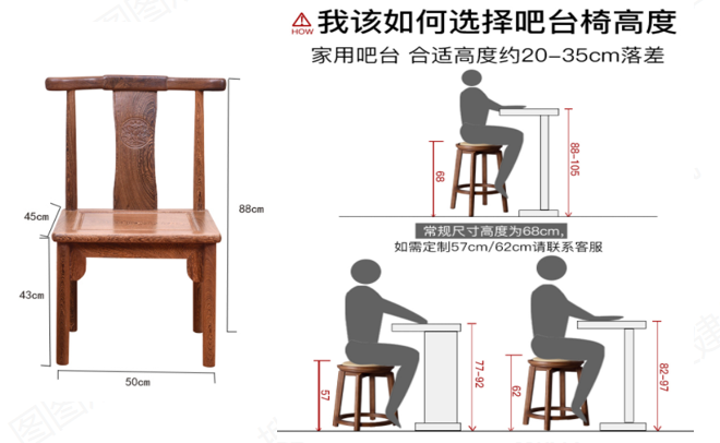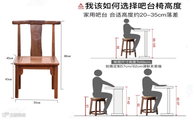 一般正常坐椅子的高度约为43cm,坐于椅子上会比较安全、舒服,高于43cm时,舒适度会下降,安全系数也会降低,比如下方吧台的高度。