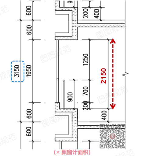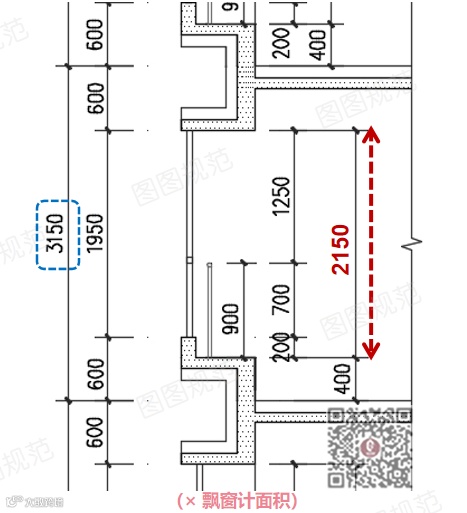 3150mm层高时,窗台高400mm,飘窗结构净高为2150mm,飘窗计面积。▼▼