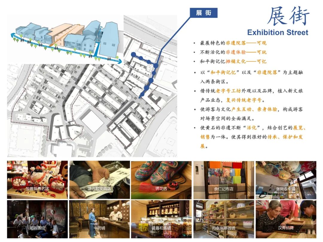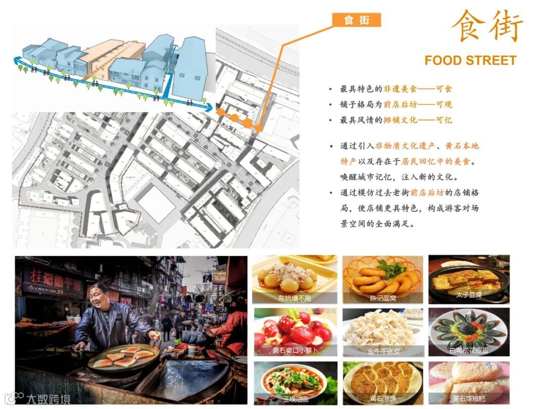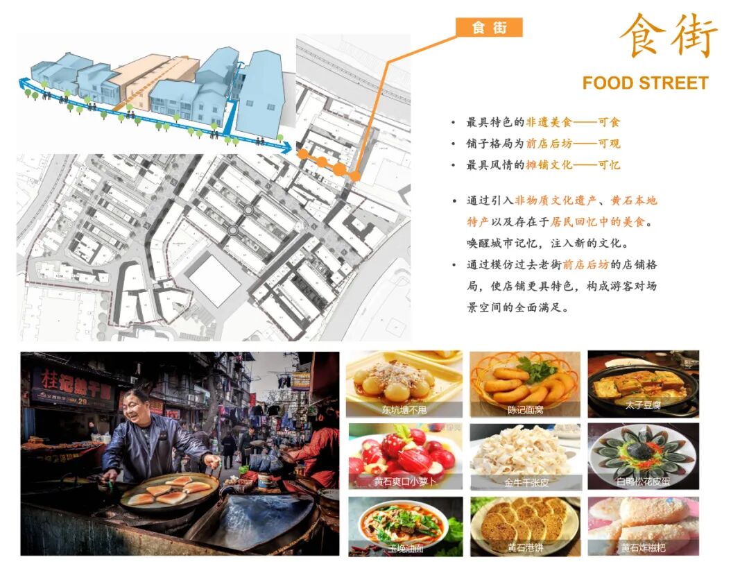 本项目有别于其他城市常见的古街、老街等步行慢街的商业形式,多以小商品批发为主的商业业态。只有在街区之中引入地方非遗文化产业,打造网红食街与展街,引入更多年轻载体,推动地摊儿经济等,为街区注入鲜活的力量,带动街区氛围,这样才能吸引年轻群体进入空间,参与其中,最终激发社区活力,活络老街。