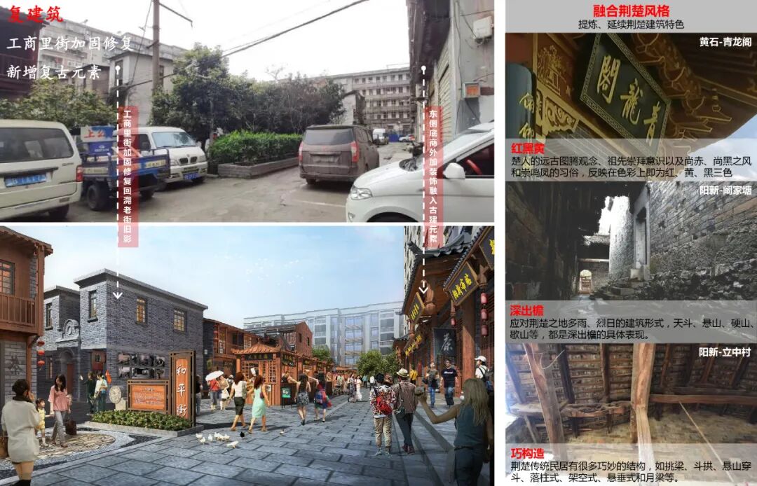 集市文化,有别于城市慢街空间,强调货物贸易批发,设计富有荆楚文化特色的深出檐,外展廊道,便于批发商品展示与游客晴雨时的交通便利。提出“微改造”理念,在重要节点区域,恢复老街旧时的中西式建筑风貌,增加街区的节奏感,避免千篇一律。