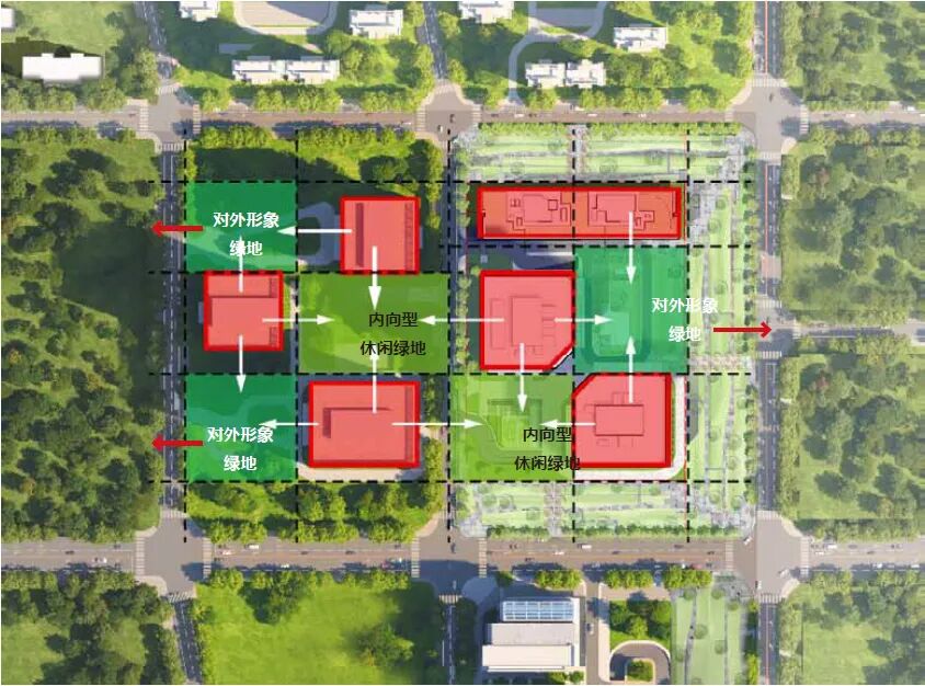 设计延续场地周边棋盘格布局,多层塔楼设置于地块北侧,两座高层办公塔楼于南侧对角线而立,形成错落有致的城市天际线。并通过多座建筑体量围合退让,在场地西南与东北形成了两个风格不同的广场,保持空间连续性和整体性的同时,增加场地的开放性,激发场所活力。