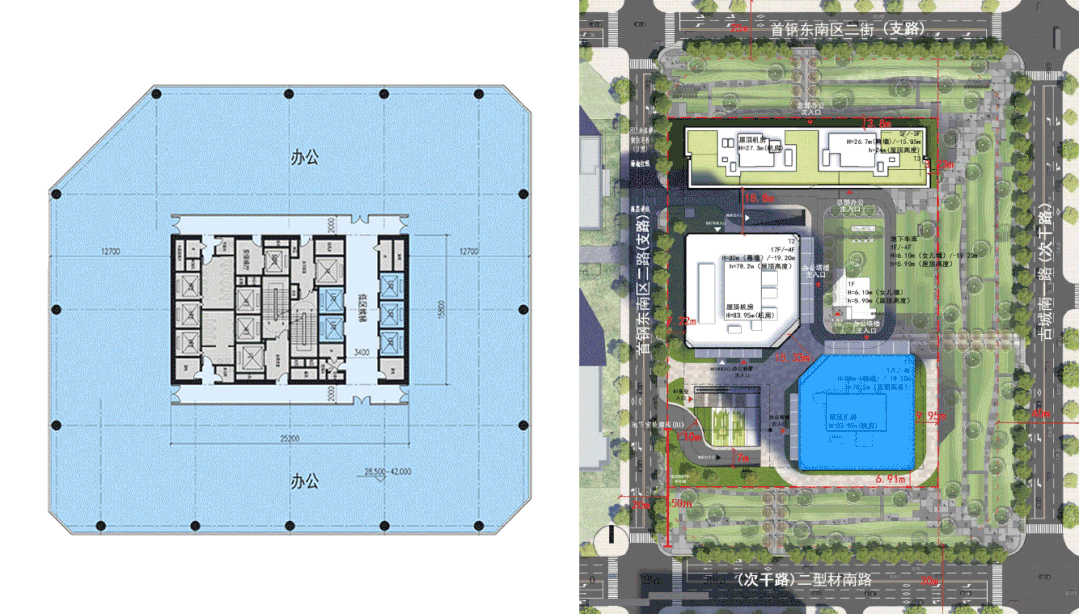 项目位于首钢园区景观绿化轴线及主要商业金融集中用地区域东南交汇处,基地平整方正,西侧可眺望商务区中心公园,南侧紧邻地铁11号线,北侧5分钟步行可至地铁1号线,交通及景观优势明显。“对于这个项目,我们不能只单单思考地块内的建筑要如何打造,它是属于整个园区总体规划中的一部分,地块西侧、南侧均是金融用地,我们的设计要在融入周边肌理的同时形成特色。”温子先博士如是说。