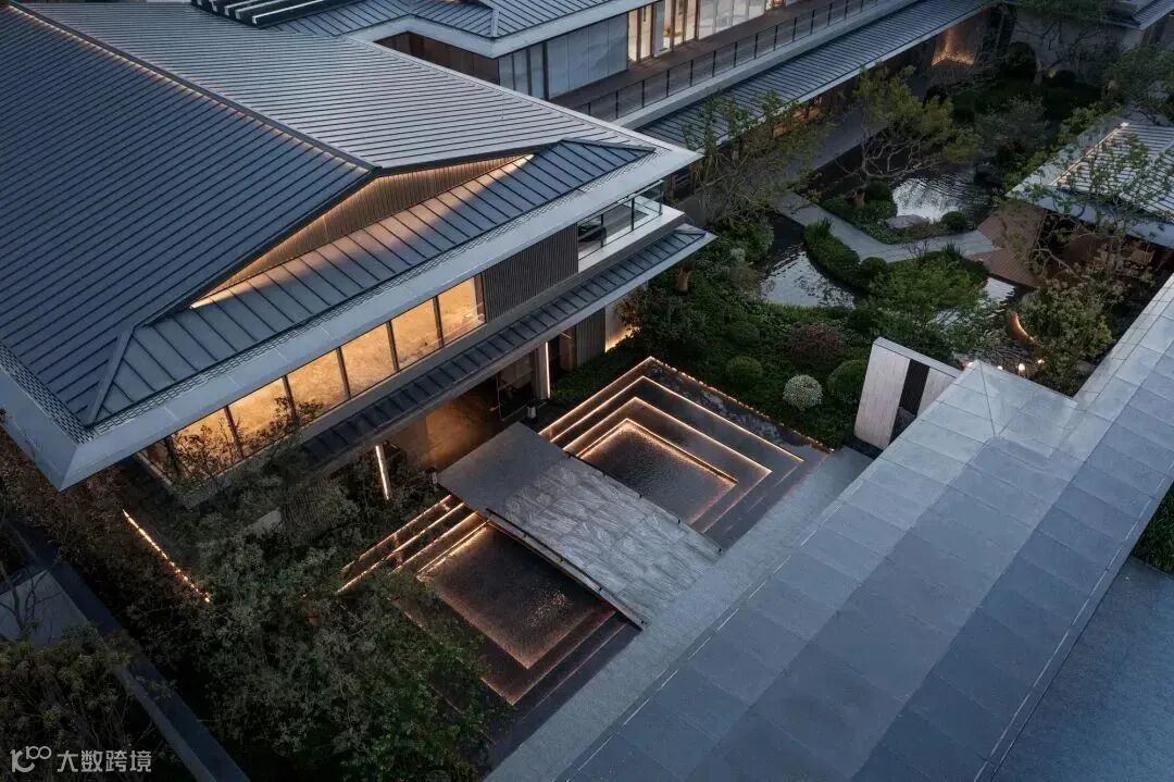 设计采用海派风格,现代简约中透露着古典的气息。内场入口空间采用人车分流的酒店式环岛落客,深沉的水景和景墙立面营造项目的高端调性。